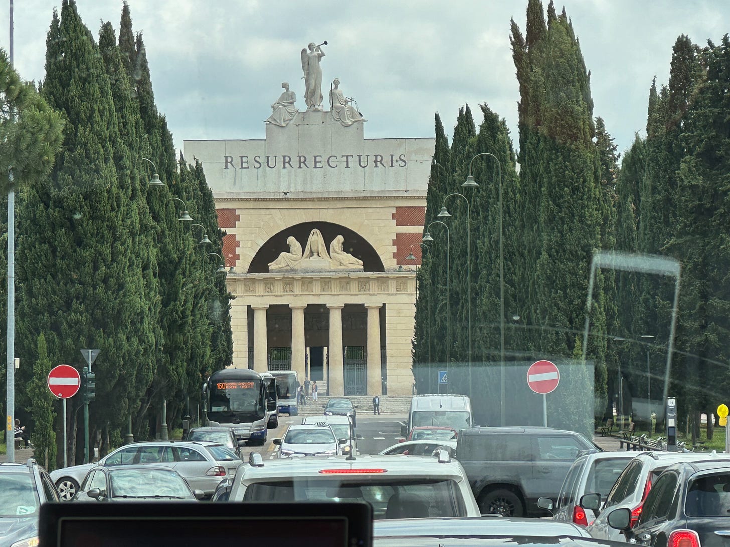 It was on the bus that I saw it at the end of the street. It was clearly a cemetery. I would later find out that it is called the Cimitero Monumentale. But what caught my eye was not the ornate sculptures at the entrance, sublime though they were. It was one word, carved into the facade in huge letters, so it cannot be missed: Resurrecturis.